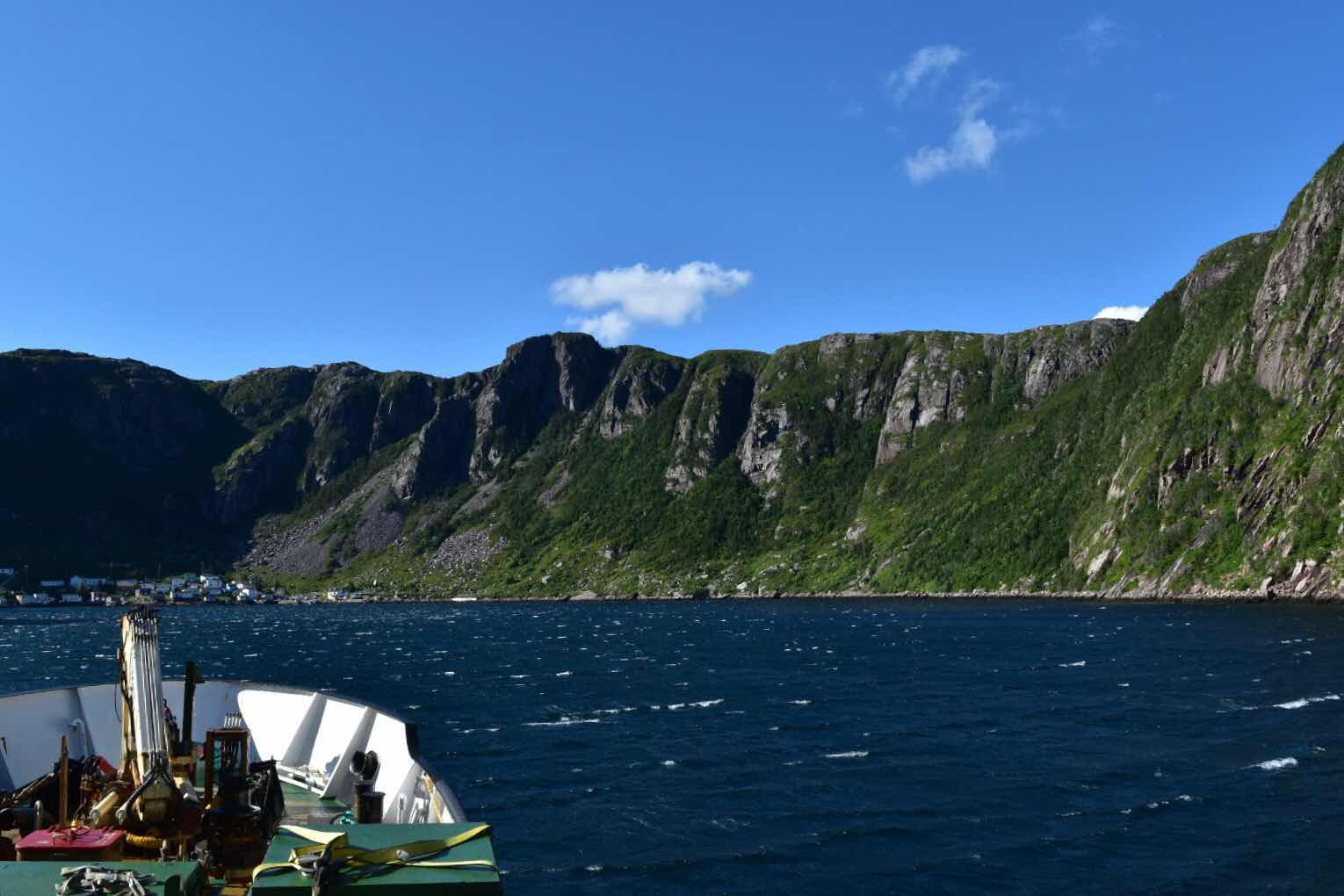 The fjord walls leading to Francois remind one of a fortress. Note how the village on the left is dwarfed by the fjord walls.