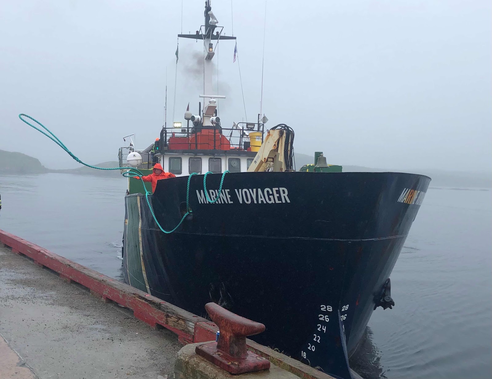 The Grey River Mail Box being hoisted off the Marine Voyager.
