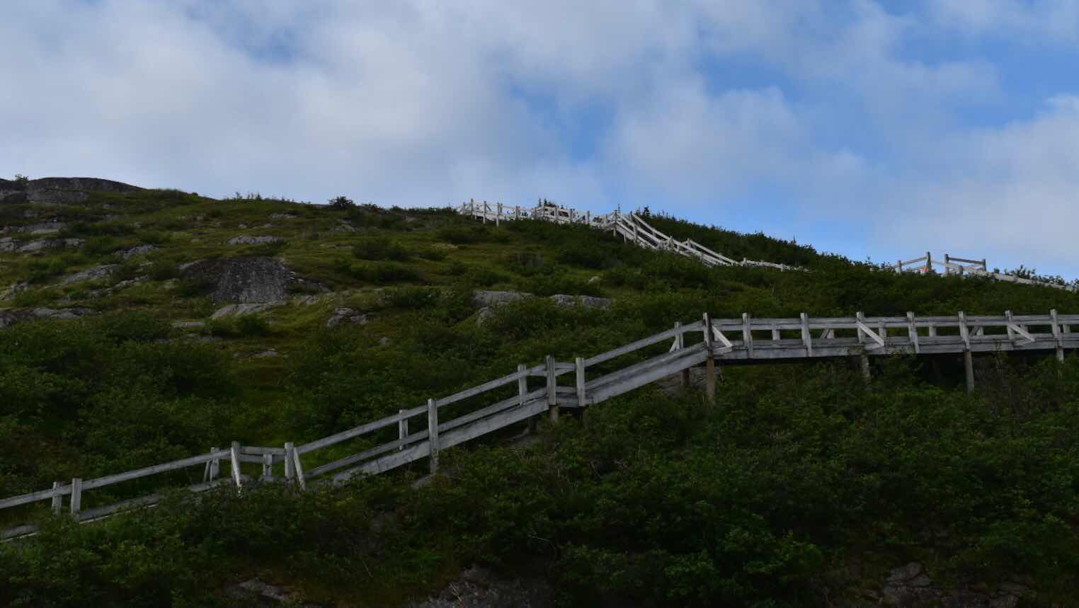 The wooden staircase to the summit of Maiden Tea Hill, overlooking Burgeo and surrounding area.